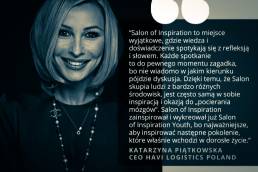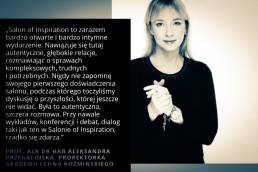 „Salon of Inspiration to zarazem bardzo otwarte i bardzo intymne wydarzenie. Nawiązuje się tutaj autentyczne, głębokie relacje, rozmawiając o sprawach kompleksowych, trudnych i potrzebnych. Nigdy nie zapomnę swojego pierwszego doświadczenia salonu, podczas którego toczyliśmy dyskusje o przyszłości, której jeszcze nie widać. Była to autentyczna, szczera rozmowa. Przy nawale wykładów, konferencji i debat, dialog taki jak ten w Salonie, rzadko się zdarza.”
