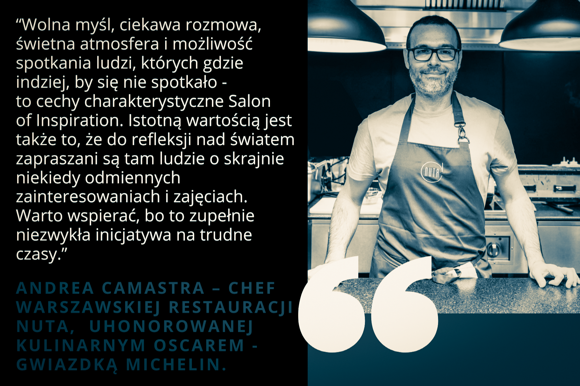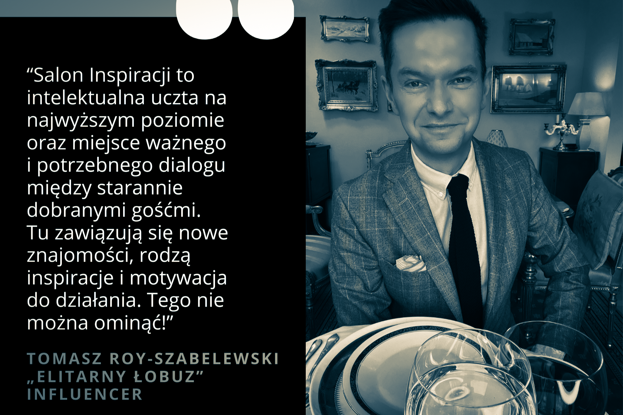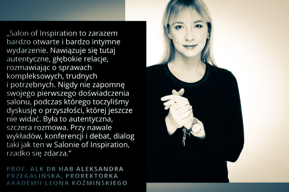 „Salon of Inspiration to zarazem bardzo otwarte i bardzo intymne wydarzenie. Nawiązuje się tutaj autentyczne, głębokie relacje, rozmawiając o sprawach kompleksowych, trudnych i potrzebnych. Nigdy nie zapomnę swojego pierwszego doświadczenia salonu, podczas którego toczyliśmy dyskusje o przyszłości, której jeszcze nie widać. Była to autentyczna, szczera rozmowa. Przy nawale wykładów, konferencji i debat, dialog taki jak ten w Salonie, rzadko się zdarza.”