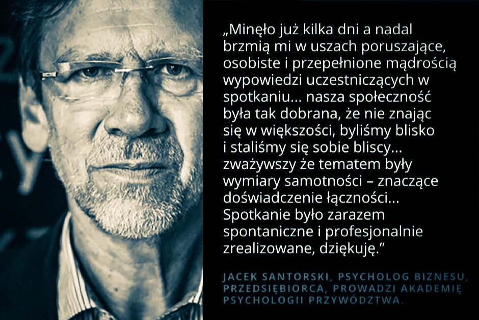 „Minęło już kilka dnia, a nadal brzmią mi w uszach poruszające, osobiste i przepełnione mądrością wypowiedzi uczestniczących w spotkaniu… nasza społeczność była tak dobrana, że nie znając się w większości, byliśmy sobie bliscy… zważywszy, że tematem były wymiary samotności - znaczące doświadczenie łączności… Spotkanie było zarazem spontaniczne i profesjonalnie zrealizowane, dziękuję.”